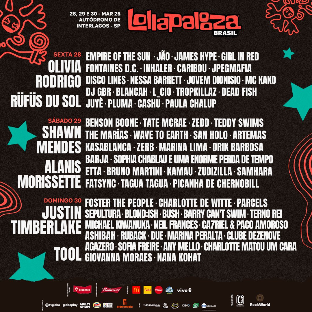 Line-up de Peso: Os headliners deste ano incluem grandes nomes como Olivia Rodrigo, Justin Timberlake, Shawn Mendes e Alanis Morissette. Além disso, artistas como Sepultura, em sua turnê de despedida, e o duo eletrônico Rüfüs Du Sol também prometem shows inesquecíveis. Confira toda line-up a seguir: